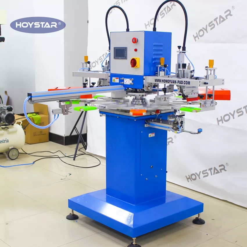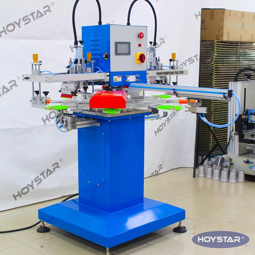 HOYSTAR е надежден производител и доставчик в Китай; Тази 2-цветна автоматична ситопечатна машина за охладители на кутии HOYSTAR Koozies Подходяща за хранително-вкусовата и опаковъчната промишленост, специализирана за koozies и охладители за консерви, тази автоматична машина за ситопечат безпроблемно автоматизира целия процес на двустранен печат. От зареждане до печат, сушене, завъртане на 180 градуса, печат от втора страна и окончателно разтоварване