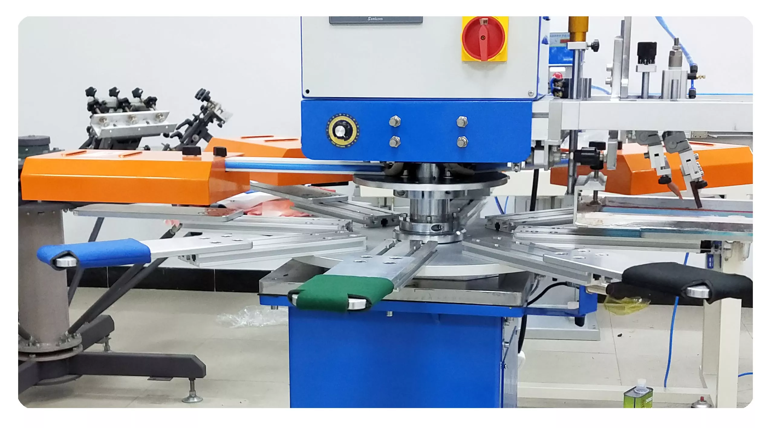 5. Въртящата се работна маса включва осем станции: една за зареждане, една за печат, две за сушене и една за разтоварване, позволявайки пет станции да работят едновременно.