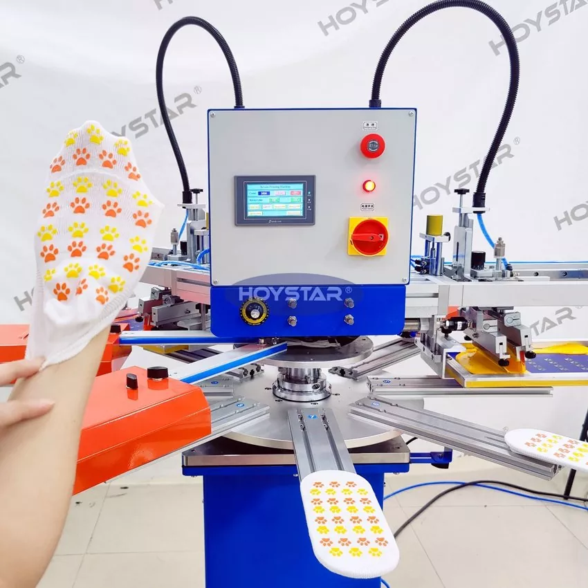 Като професионален производител в Китай бихме искали да ви предоставим машина за ситопечат с 2 цвята HOYSTAR с висока скорост. Нашите машини използват PLC и сензорен екран за управление и се използват главно за отпечатване на различни видове чорапи. Машината може да печата върху подметките и петите на чорапите и е оборудвана със сушилня, която може да изсуши добре силикона и мастилото.