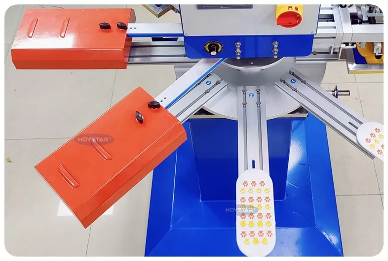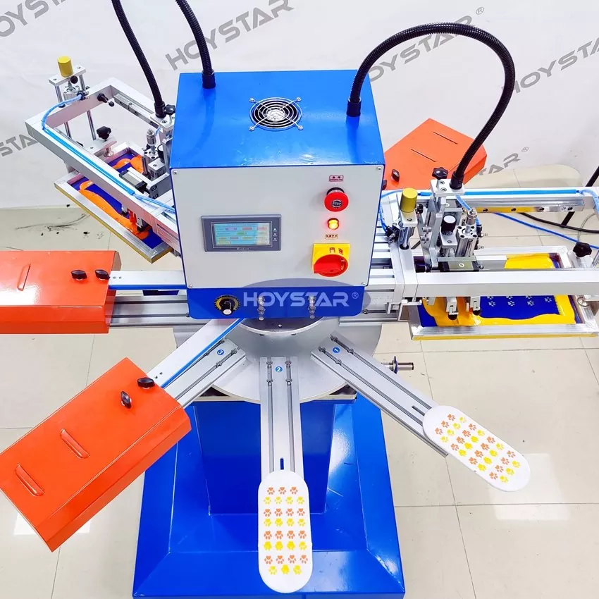 Като професионален производител и доставчик, HOYSTAR High Rapid 2 Colors Socks Screen Printing Machine е предназначена за приложения в текстилната плетачна индустрия. Със скорост до 1000PCS/Hr, той е подходящ за печат на нехлъзгащи се чорапи, бебешки чорапи, чорапи за възрастни, футболни чорапи и др. Оборудван с въртяща се работна маса, той е много удобен за зареждане и разтоварване на чорапи. PLC управление със сензорен екран, много лесно за работа. Машината, оборудвана със система за сушене, може да изсуши добре силикона и мастилото.