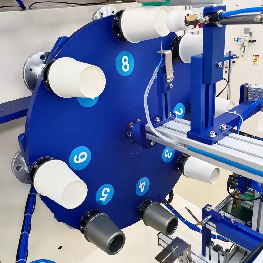 9. Позициониране с множество станции, постигнато чрез високопрецизна въртяща се система за индексиране (произведена в Тайван), осигуряваща стабилност, скорост и подобрена ефективност.
