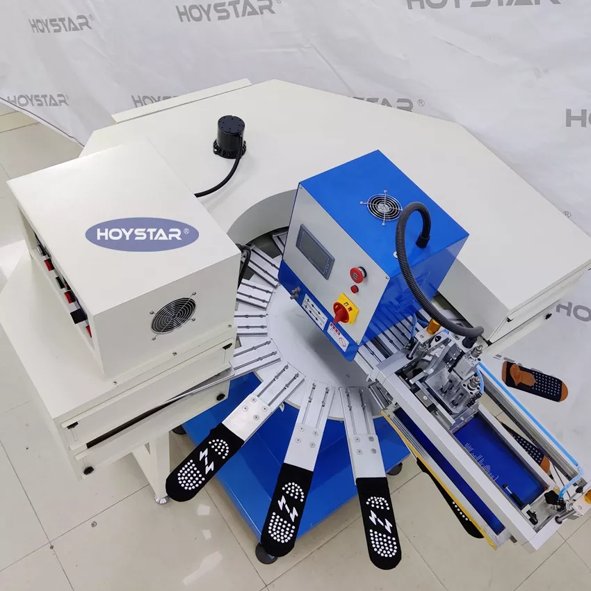 Като професионален производител и доставчик, тази машина за ситопечат на чорапи с голям размер HOYSTAR High Rapid е предназначена за приложения в текстилната плетачна индустрия. Със скорост до 1200PCS/Hr, той е подходящ за печат на неплъзгащи се чорапи, бебешки чорапи, чорапи за възрастни, футболни чорапи и др. Оборудван с въртяща се работна маса и 16 работни станции, той е много удобен за зареждане и разтоварване на чорапи. PLC управление със сензорен екран, много лесно за работа. Машината, оборудвана със система за сушене, може да изсуши добре силикона и мастилото.