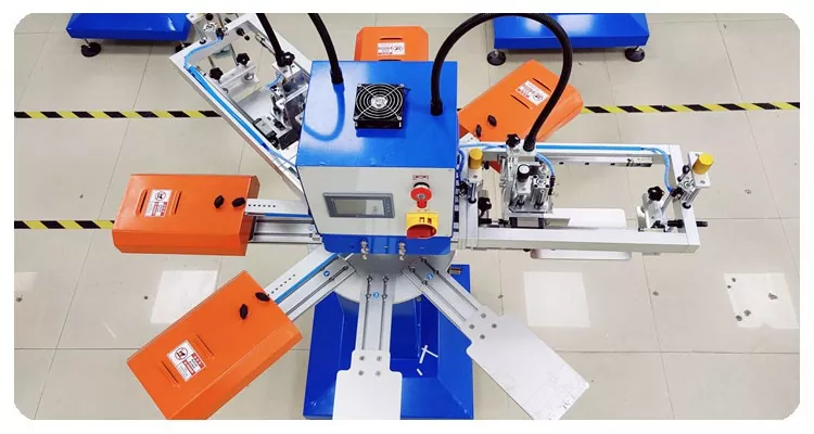 7. Машината включва общо 8 работни станции: 2 за печат, 3 за сушене и 3 за зареждане/разтоварване.