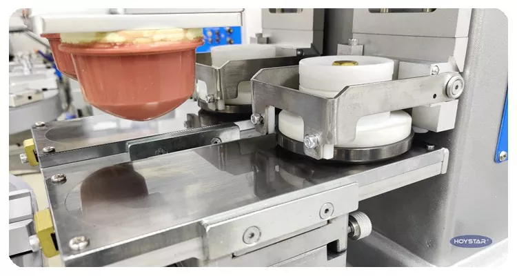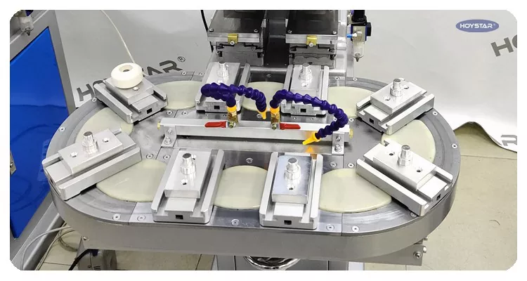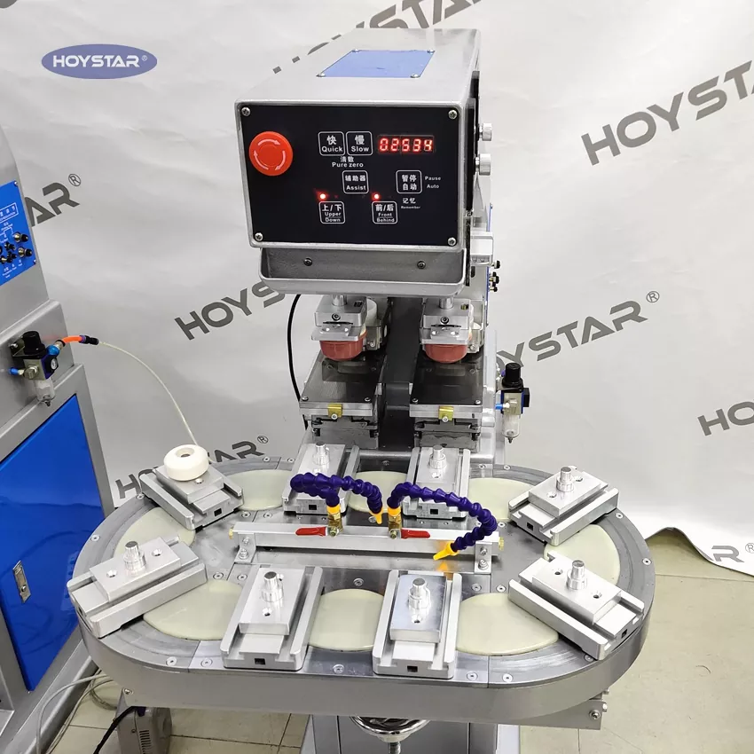 HOYSTAR е надежден производител и доставчик в Китай; Машината за тампонен печат с двуцветна ротационна маса HOYSTAR е високопроизводително и рентабилно печатно оборудване. Машината предлага удобна настройка, стабилна работа и добър печатен ефект. Машината осигурява стабилно качество на печат и е подходяща за печат на широка гама от елементи като електронни продукти, пластмасови черупки, хардуерни продукти, канцеларски материали, малки изкуства и занаяти, както и малки лога върху повърхността на подаръци и др. Може да отговори на различни изисквания за двуцветен печат на клиентите.